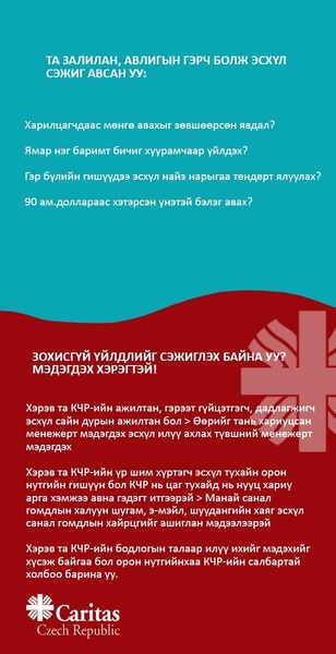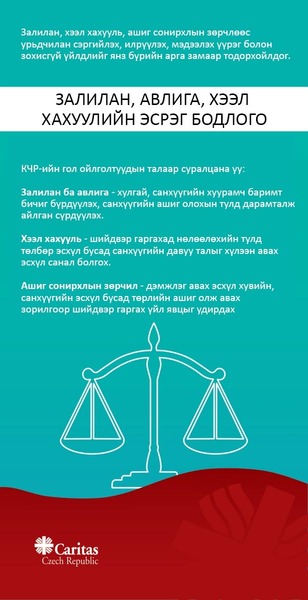 Залилан, авлига, хээл хахууль эсхүл ашиг сонирхлын зөрчил нь гарч байна гэсэн таамаглал нь маш ноцтой асуудал юм. Каритас Чех Репаблик нь аливаа зохисгүй зөрчлөөс урьдчилан сэргийлэх, илрүүлэх, үр дүнтэй хариу арга хэмжээ авахад туслах системийг бий болгох тал дээр дорвитой ажилладаг. Үүний зэрэгцээ, бид бүх хөтөлбөртөө мөнгө угаах, терроризмыг санхүүжүүлэх зорилгоор манай үйл ажиллагааг гуравдагч этгээд ашиглахаас урьдчилан сэргийлэх арга хэмжээг нэвтрүүлсэн болно.