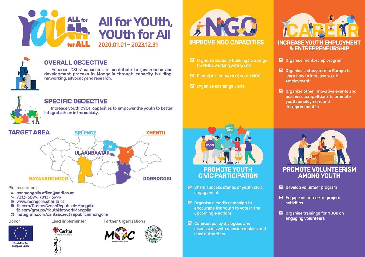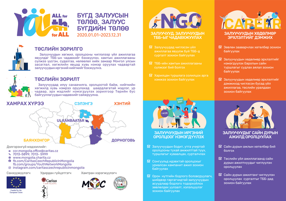Caritas Czech Republic is implementing the project “All for YOUth, YOUth for all”, funded by the European Union, along with two project partners: Mongolian Youth Center and Center of Citizenship Education.