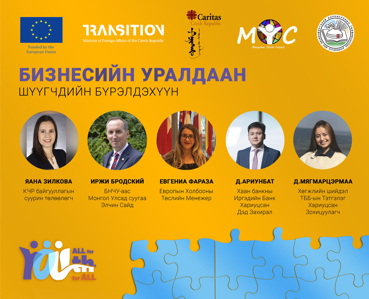 These activities are carried out within the project “All for YOUth, YOUth for all”, funded by the European Union and the Ministry of Foreign Affairs of the Czech Republic with two project partners the Mongolian Youth Council and Center of Citizenship Education.