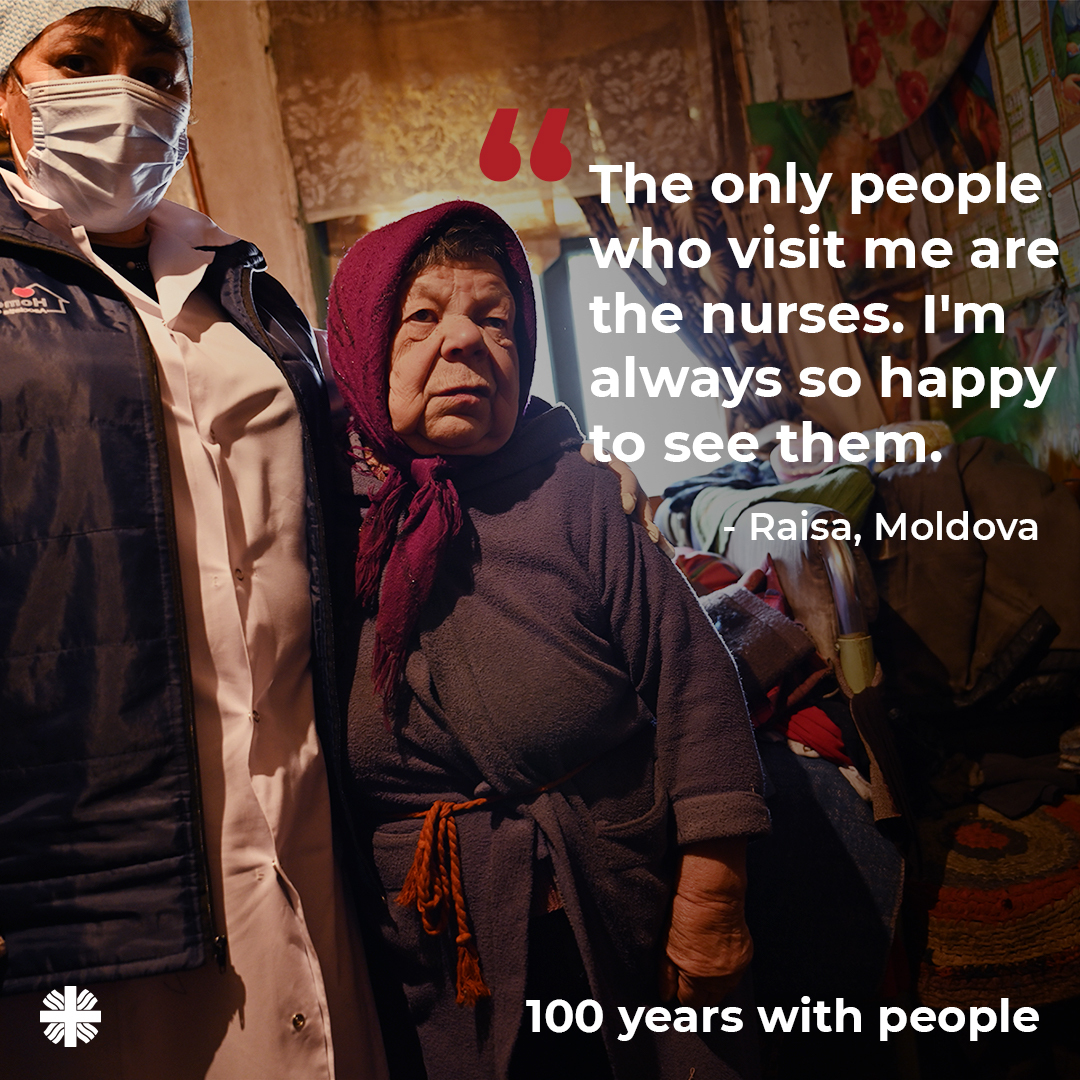 73-year-old Raisa from Moldova has to rely on the help of others because of her disability. She has no family to take care of her. Fortunately, Raisa is a client of a home care centre run by @Caritas Czech Republic in Moldova. The caregivers visit Raisa five times a week to help her with house chores and check on her health. Most importantly, they spend time with Raisa and talk with her.